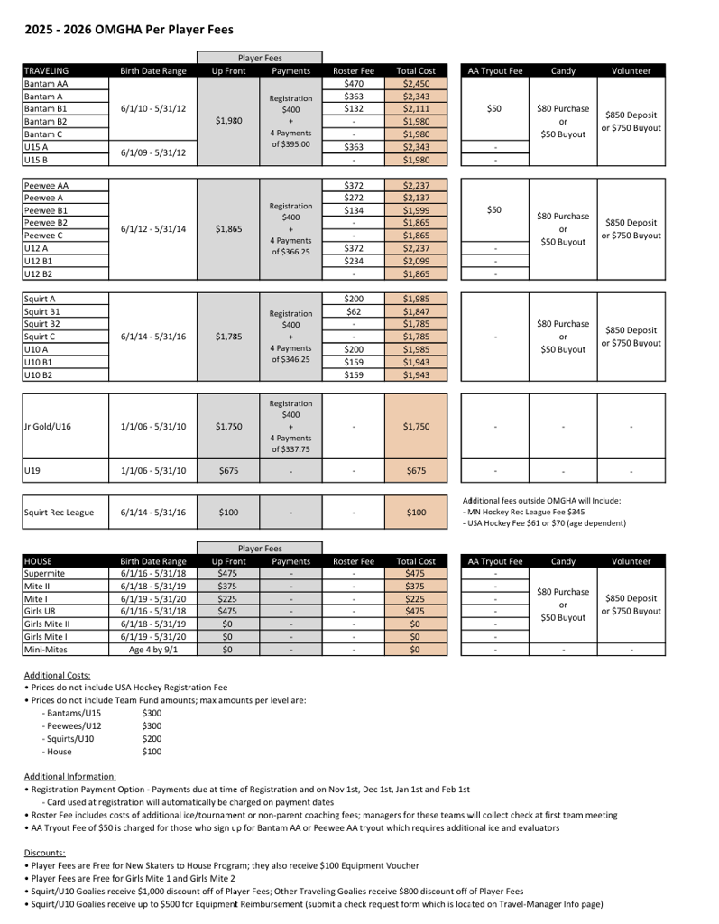 TRAVEL PLAYERS: will pay $400 (or $450 for AA tryouts) at time of registration. Families will have the option to pay the whole season in full or spread remaining total over 4 additional payments. Travel players are charged a baseline Player Fee depending on the level the are playing. After tryouts and team placements are made, certain teams may also have a Roster Fee to cover the cost for their additional ice time and tournaments. This fee will be collected via check at the first team meeting. The goal of the payment process is to create transparency to costs prior to the season and to prevent confusion/create efficiencies around collection of subsidy payments.